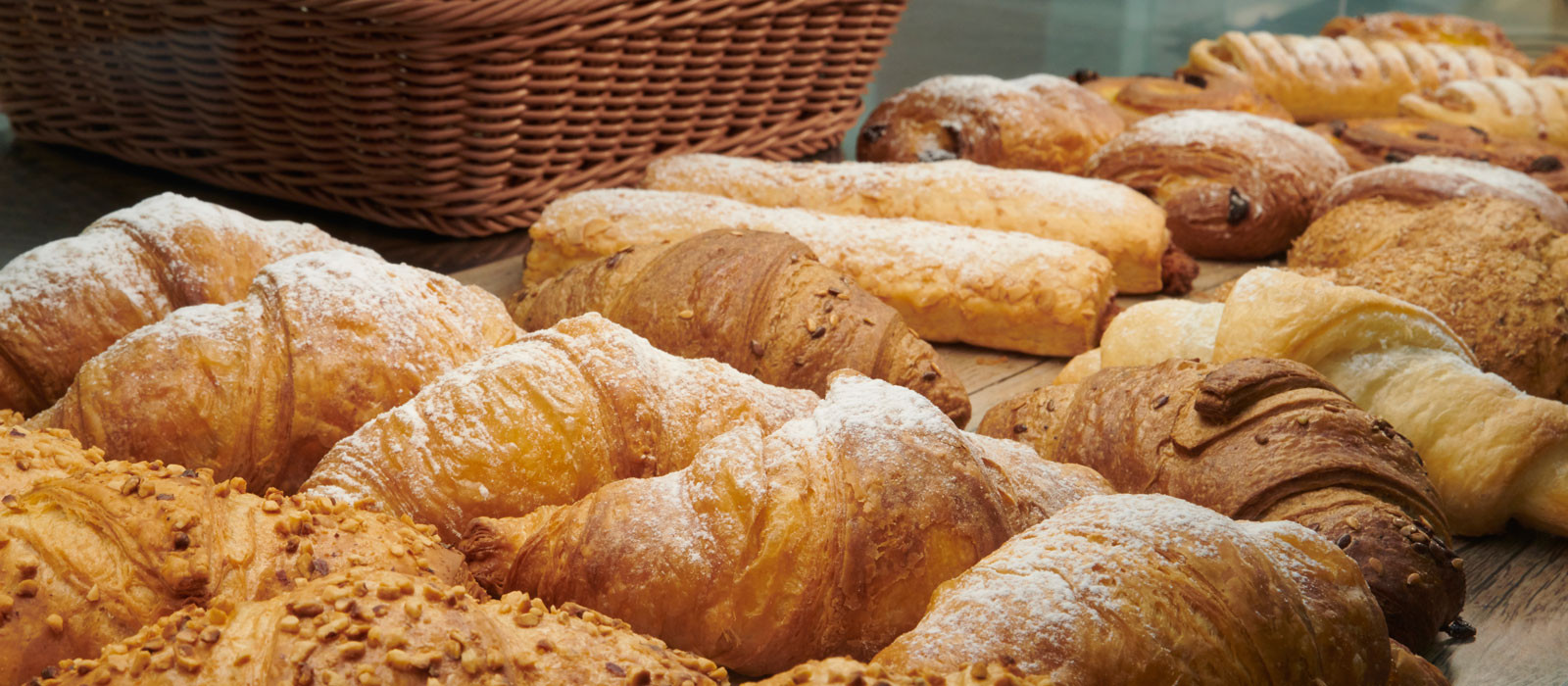 Coffee and tea, croissants, muffins, fresh fruit, pasta, sandwiches, salads, appetizer