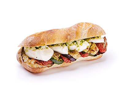 Grilled aubergines and courgettes, dried tomatoes, fior di latte mozzarella cheese and basil oil Vegetarian